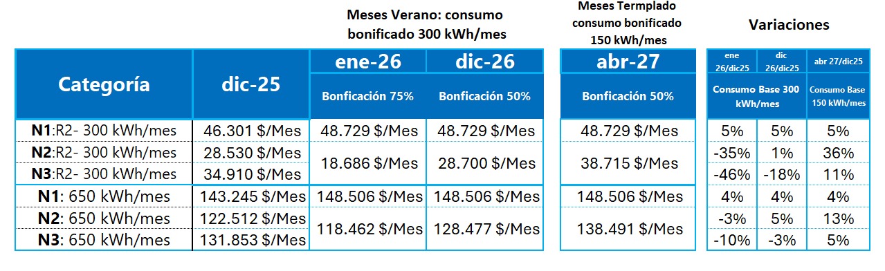 La otra novedad es que el bloque de energía a precio subsidiado será de 300 kWh en los meses de mayor consumo, mientras que el resto del año cubrirá 150 kWh. En el sistema actual es de 350 kWh para los N2 y de 250 kWh para los N3. Asimismo, quienes estén dentro de la categoría subsidiada pagarán el 50 por ciento del costo de la energía, con una bonificación inicial para enero de 2026 de 25 por ciento adicional que se va reduciendo paulatinamente hasta diciembre del año que viene, lo que se plantea como un mecanismo para evitar subas abruptas.