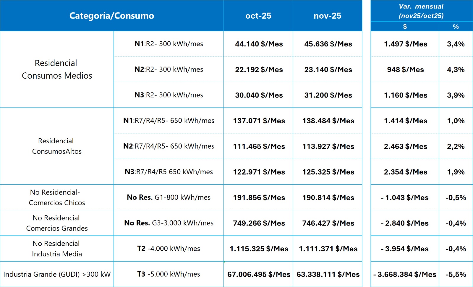–Demanda No Residencial, que incluye comercios e industrias chicas, se les reduce el PEST un 5% respecto de octubre de 2025, quedando un 8% por debajo de los usuarios residenciales.