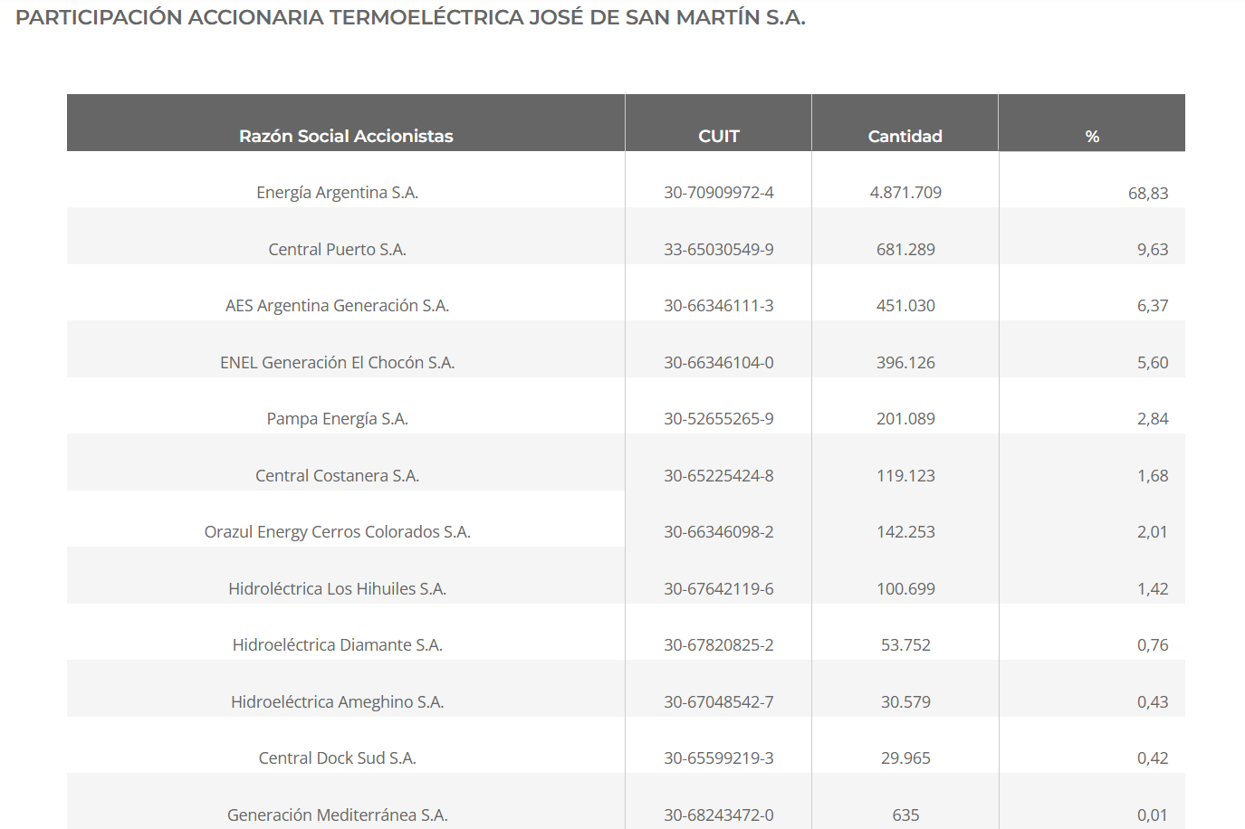 Las acciones de TMB están repartidas hoy de la siguiente manera: Enarsa 65%, Central Puerto 10,6%, AES 7,1%, Enel 6,2%, Pampa 3,2%, Orazul Energy 2,2%, además de otras participaciones menores.