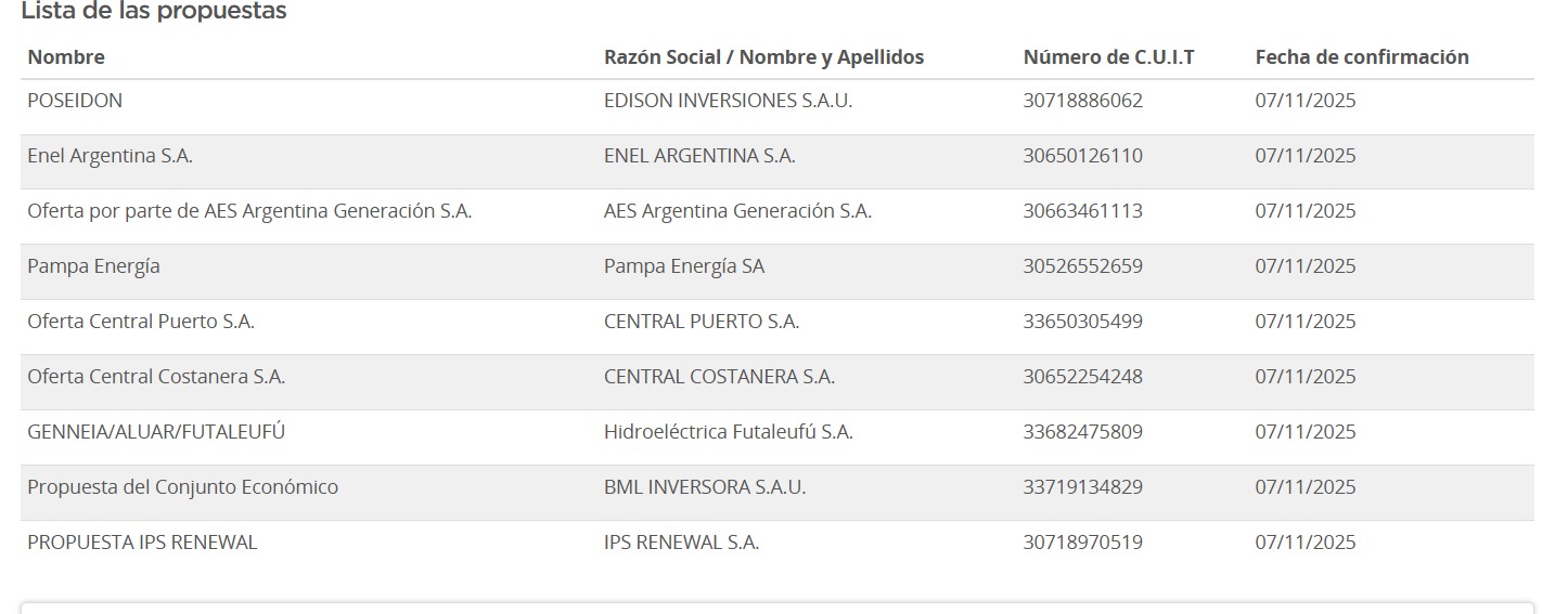 La nómina se completa con el Edison Inversiones, del que participa el  Grupo Neuss, cercano al asesor Santiago Caputo, que pocos meses atrás compró algunas distribuidores eléctricas del interior y una represa en Mendoza; además presentaron ofertas BML Inverosa y IPS Renewal, sin antecedentes locales.