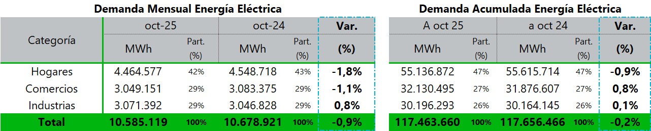 En lo que se refiere a la demanda de energía eléctrica, en octubre se observa una baja del 0,9 por ciento respecto al mismo mes del año pasado, con una temperatura promedio 1 grado menor (en torno a 19,5°).