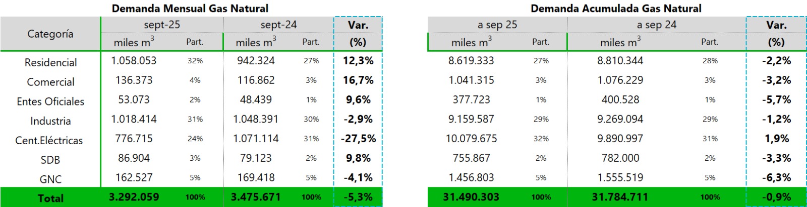 En septiembre cayó la demanda de gas natural y la de electricidad registró una baja en octubre