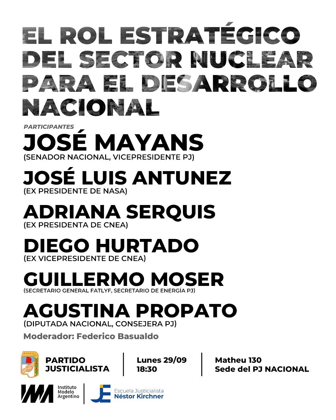 El evento contará con la participación del senador formoseño José Mayans. También serán de la partida José Luis Antunez, ex presidente de Nucleoeléctrica Argentina, Adriana Serquis, ex presidenta de CNEA, Diego Hurtado, ex vice de ese organismo, la diputada nacional Agustina Propato y Guillermo Moser, secretario general de FATLYF y coordinador de la Secretaría de Energía y Minería del PJ. La moderación estará a cargo de Federico Basualdo.