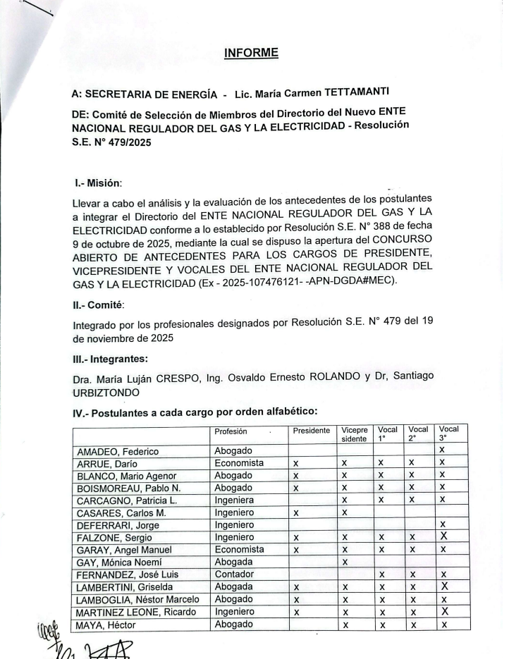 El informe fue elevado a la secretaria María Tettamanti el 12 de enero y ese mismo día, sin realizar ningún análisis adicional ni expresar fundamento alguno, la ex ejecutiva de Caumuzzi dirigió una nota al secretario coordinador de Energía y Minería, Daniel González, con los cinco elegidos para integrar el directorio nada menos que por cinco años (con mandatos escalonados).