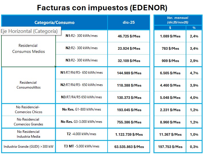 Por su parte, los hogares de consumos bajos, es decir hasta 300 kWh mensuales, tendrán un impacto porcentual menor a los de alta demanda pero repartido de la siguiente manera: 2,4 por ciento para los N1, 3,4 por ciento para los N2 y 2,9 por ciento para los N3. Asimismo, los no residenciales –industria y comercio verán aumentos de hasta 1,2 por ciento pero seguirán por debajo de lo que pagaban en octubre de 2025, lo mismo que los grandes usuarios, con un alza del 0,5 por ciento por debajo del mes anterior.