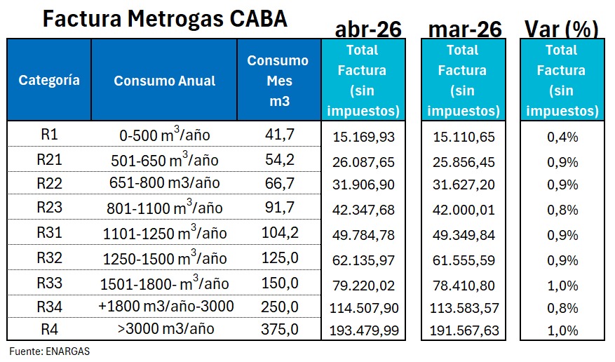 El Gobierno oficializó el ajuste para los usuarios de gas natural para abril, con la novedad de que comienza a implementarse el esquema de subsidios “focalizados”. El Ente Nacional Regulador del Gas (ENARGAS) dio a conocer los nuevos cuadros tarifarios, que para los hogares de Metrogas implica una suba de hasta 1 por ciento. En tanto para el resto de las distribuidoras de gas del país, el aumento es similar.
