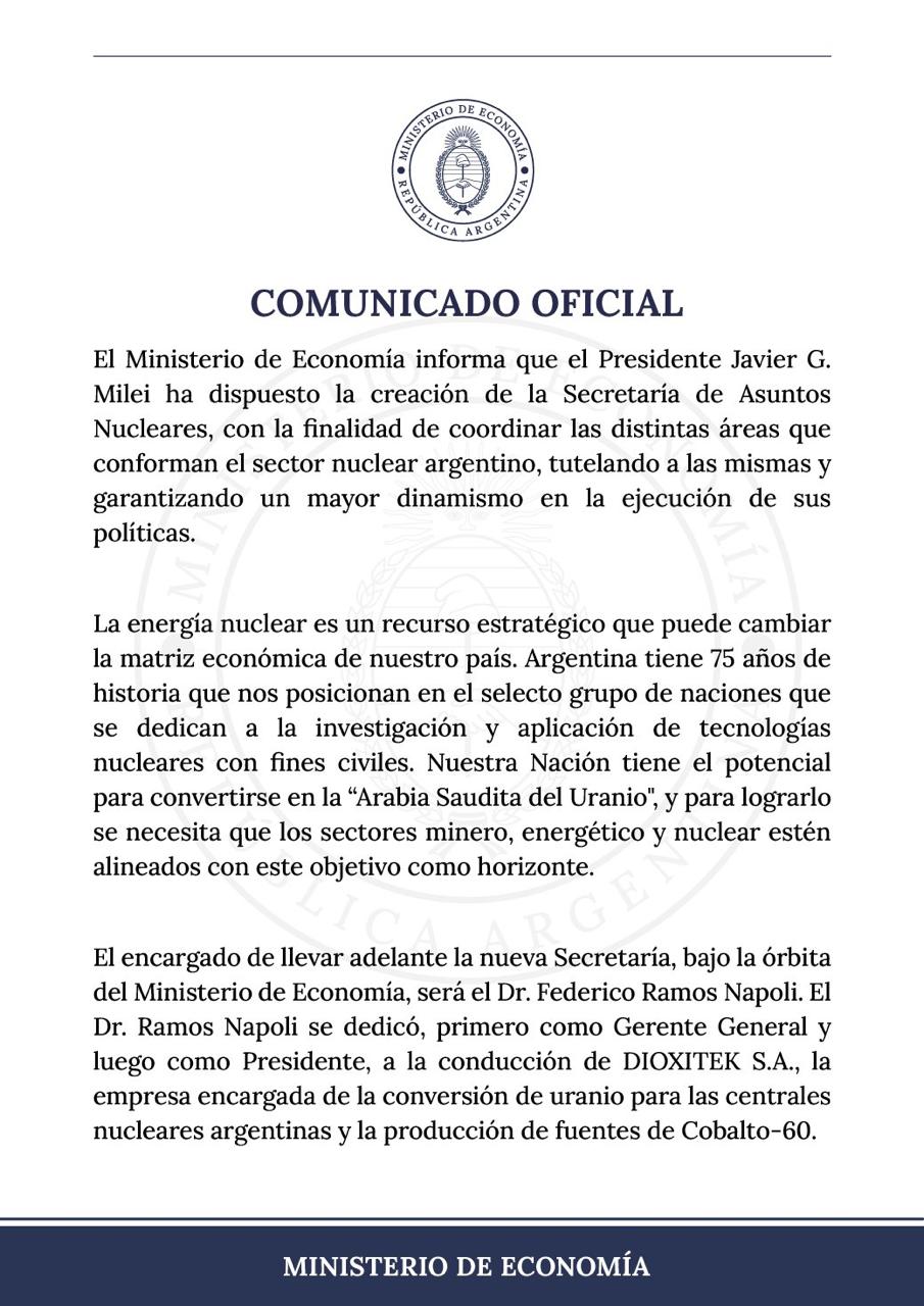 Asimismo, la nueva cartera nuclear tendría a su cargo la gestión de Nucleoeléctrica Argentina, la empresa que opera las centrales nucleares y que el gobierno busca privatizar. También pasaría a controlar Dioxitek, una compañía estatal que fabrica elementos combustibles.