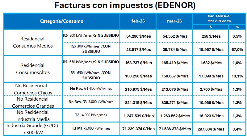 En consecuencia, un hogar subsidiado con consumo de hasta 300 kWh pasará de pagar en febrero $23.827 a $39.784, lo que implica un 67 por ciento más. En el caso de un cliente consumo mayor a 650 kWh, la factura alcanzará los $150.657, mientras que el mes anterior pagó $133.258, es decir una diferencia del 13,1 por ciento.