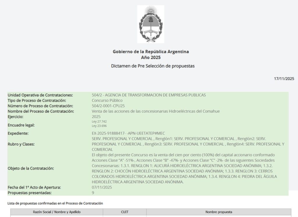 La venta del paquete accionario de cuatro centrales hidroeléctricas avanza y comienza a mostrar algunas pistas: la secretaría de Energía analizó las propuestas técnicas y los antecedentes de los interesados, declarando “admisibles” ocho ofertas y rechazando la de IPS Renewal por documentación insuficiente.